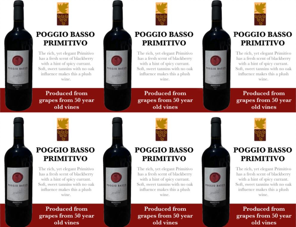 Poggio Basso Primitivo is made entirely in the inert containers of concrete tanks in order to extract the pure expression of the fruit. While Primitivo is a dark and typically tannic grape, Poggio Basso Primitivo is light and fruit-forward. It is a wine for any time of day.